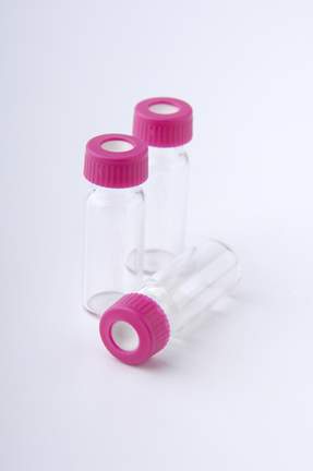 Clear 2ml vial kit, 9mm Wide-opening, Short screw thread, Pink caps, Ivory PTFE/Red rubber septa